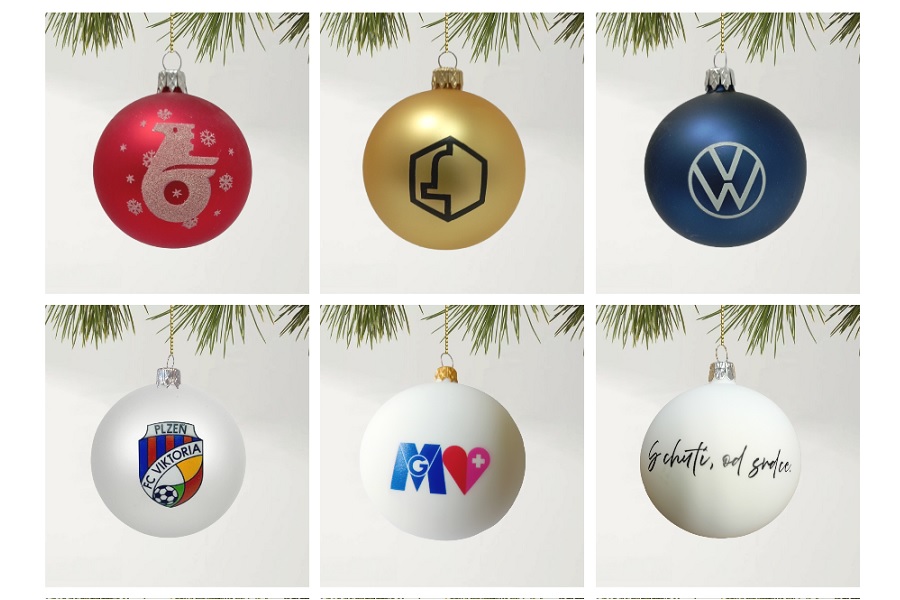 Nabízíme široký výběr tvarů (koule, srdce, špice, zvonečky), barevných variant i povrchových úprav. Loga zpracováváme v jedné či více barvách a vždy vycházíme z přání zákazníka.